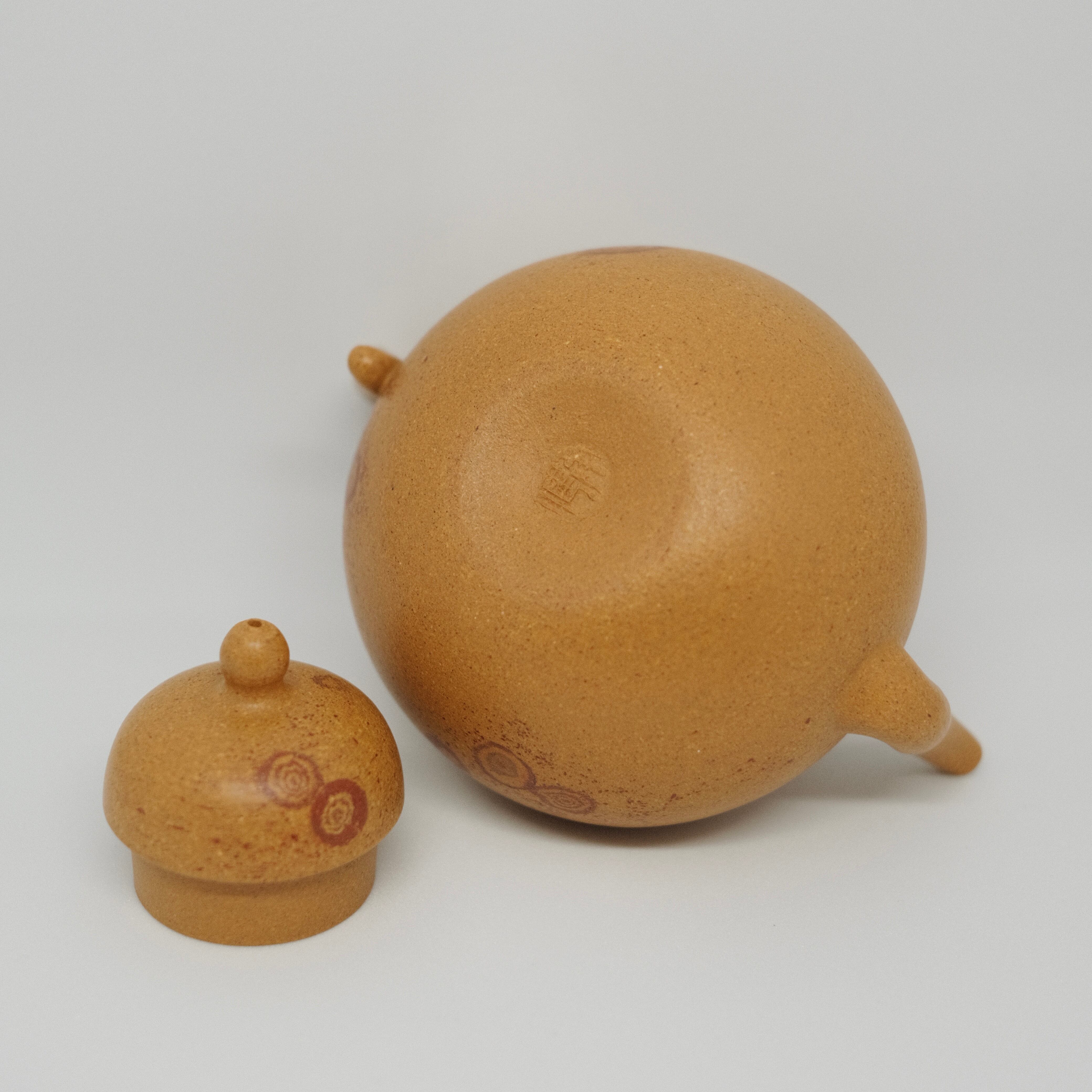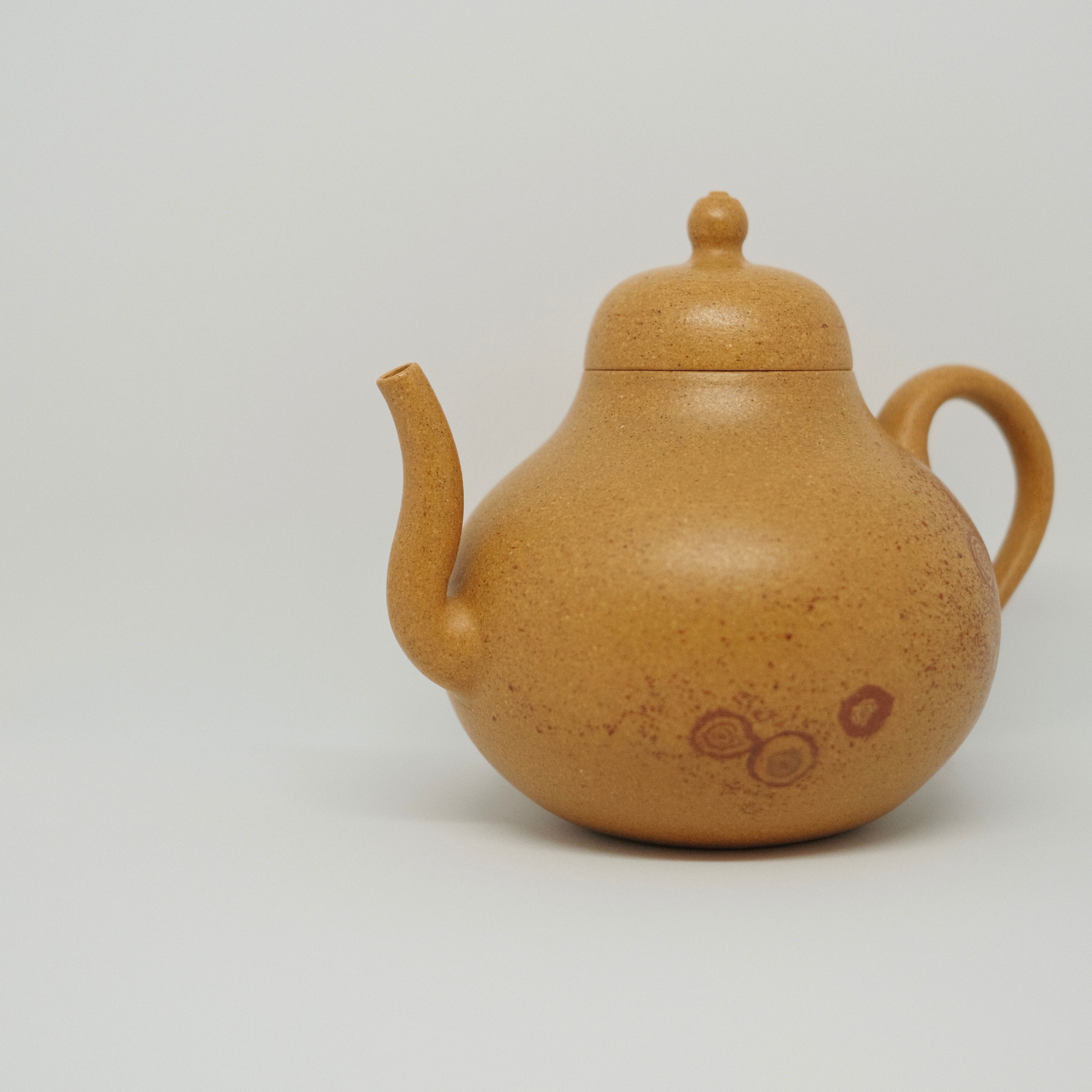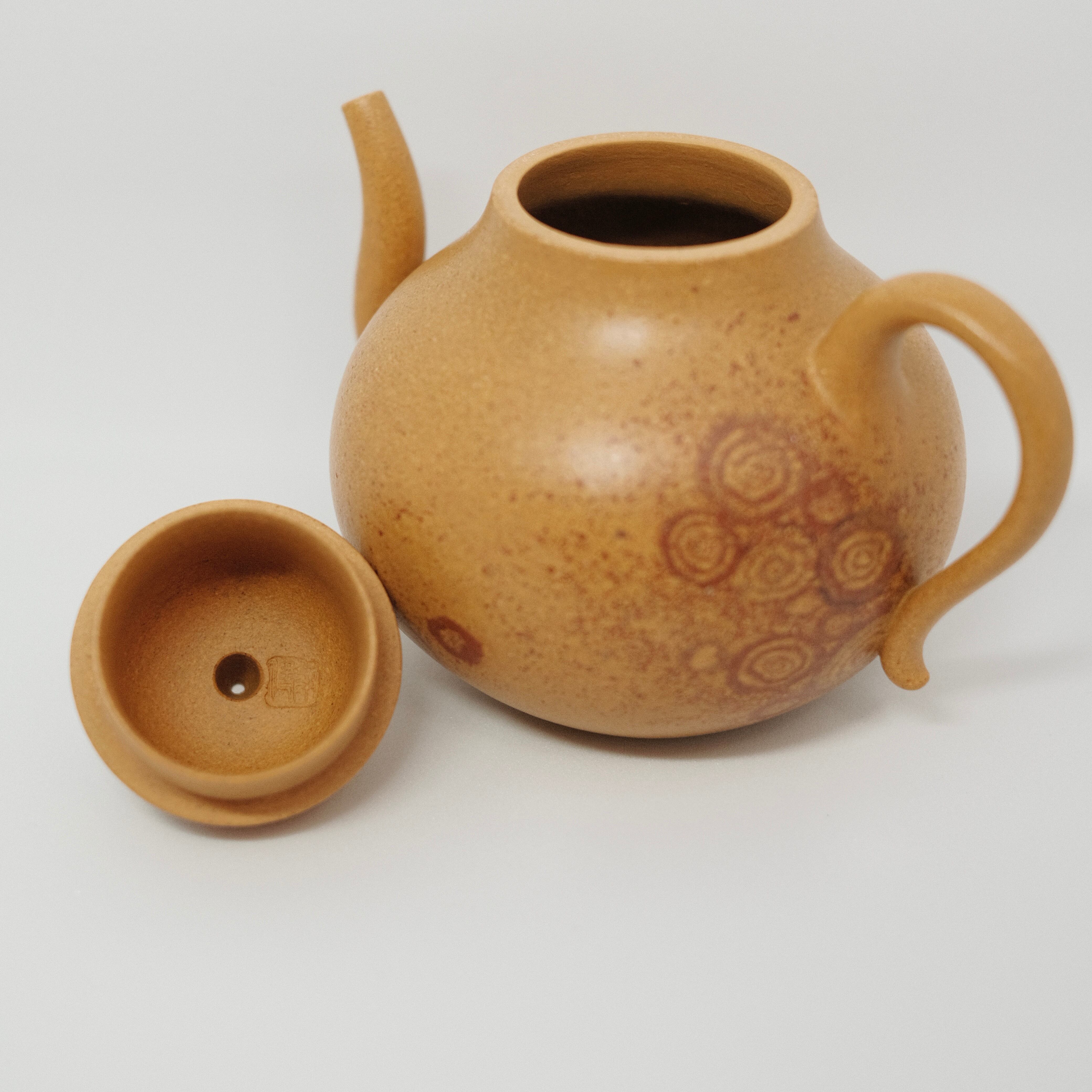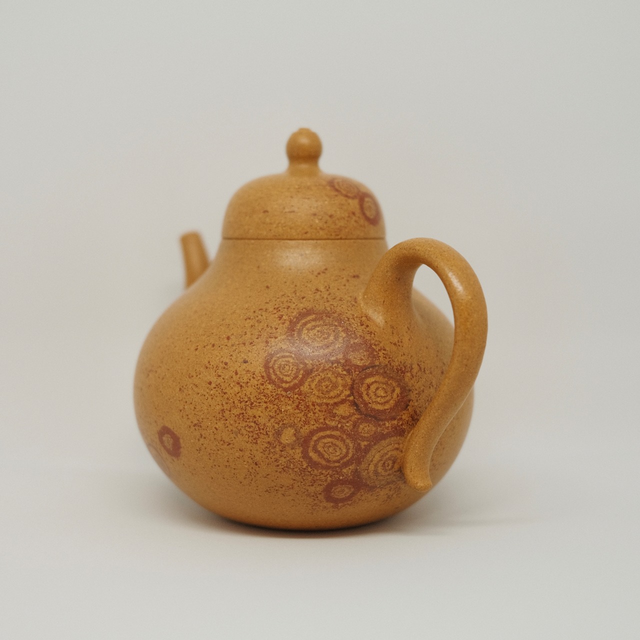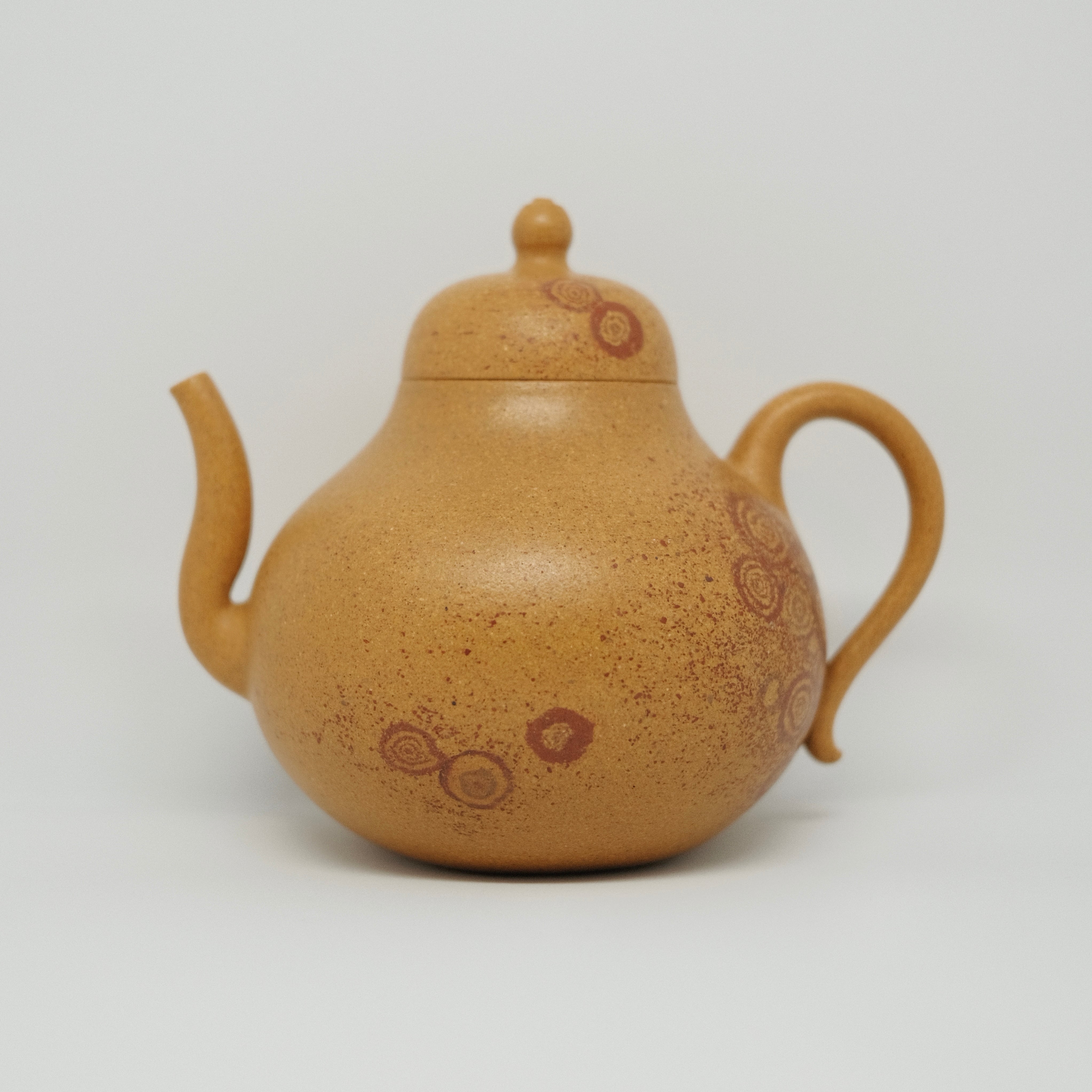 宜興産段泥を用いた全手工の紫砂壺。壺身には朱泥による泥絵が施され、湘妃竹を思わせる斑紋が趣ある表情を生み出しています。涙の跡のような斑点と霞のような風合いが調和し、紫砂壺ならではの風雅な趣を感じさせる一品です。