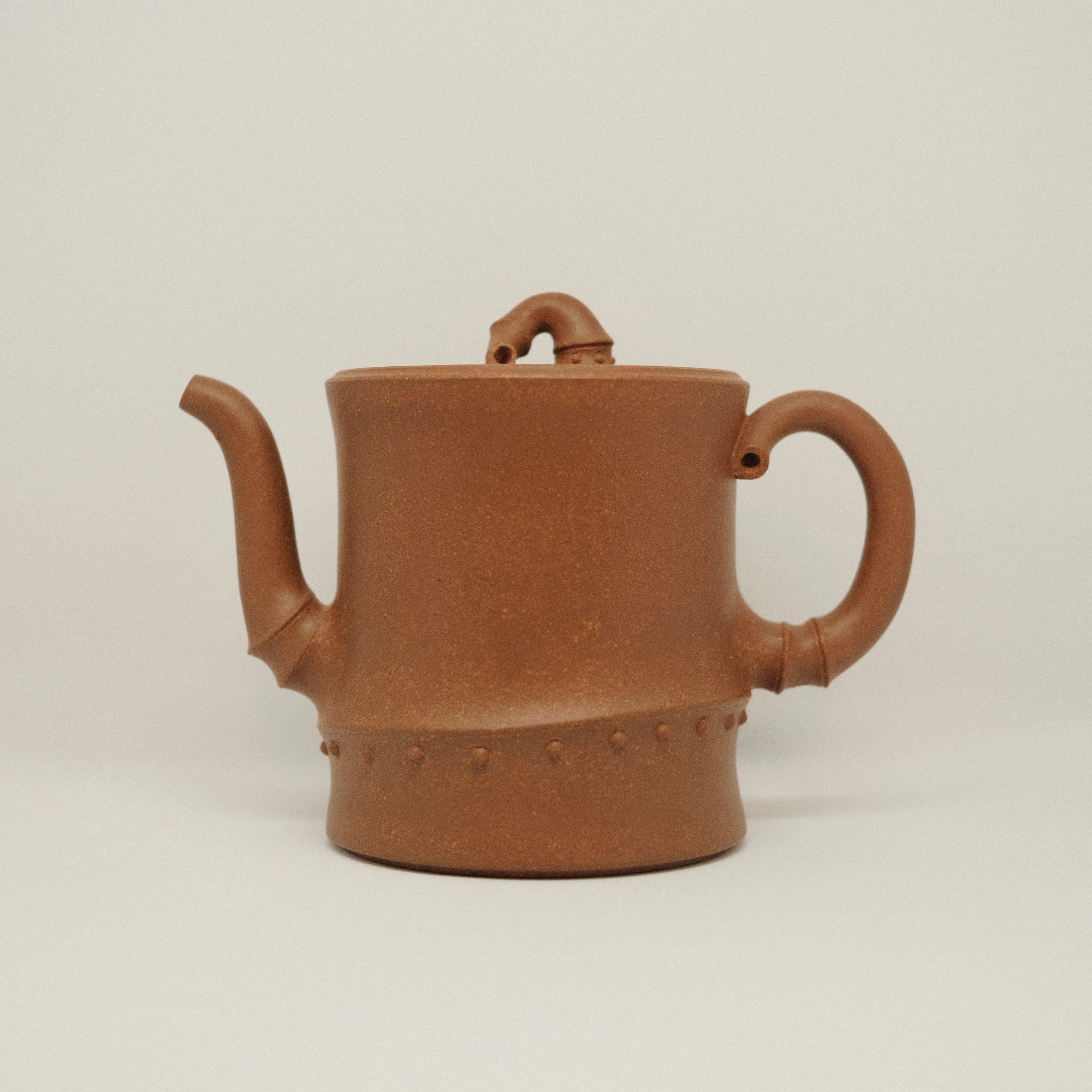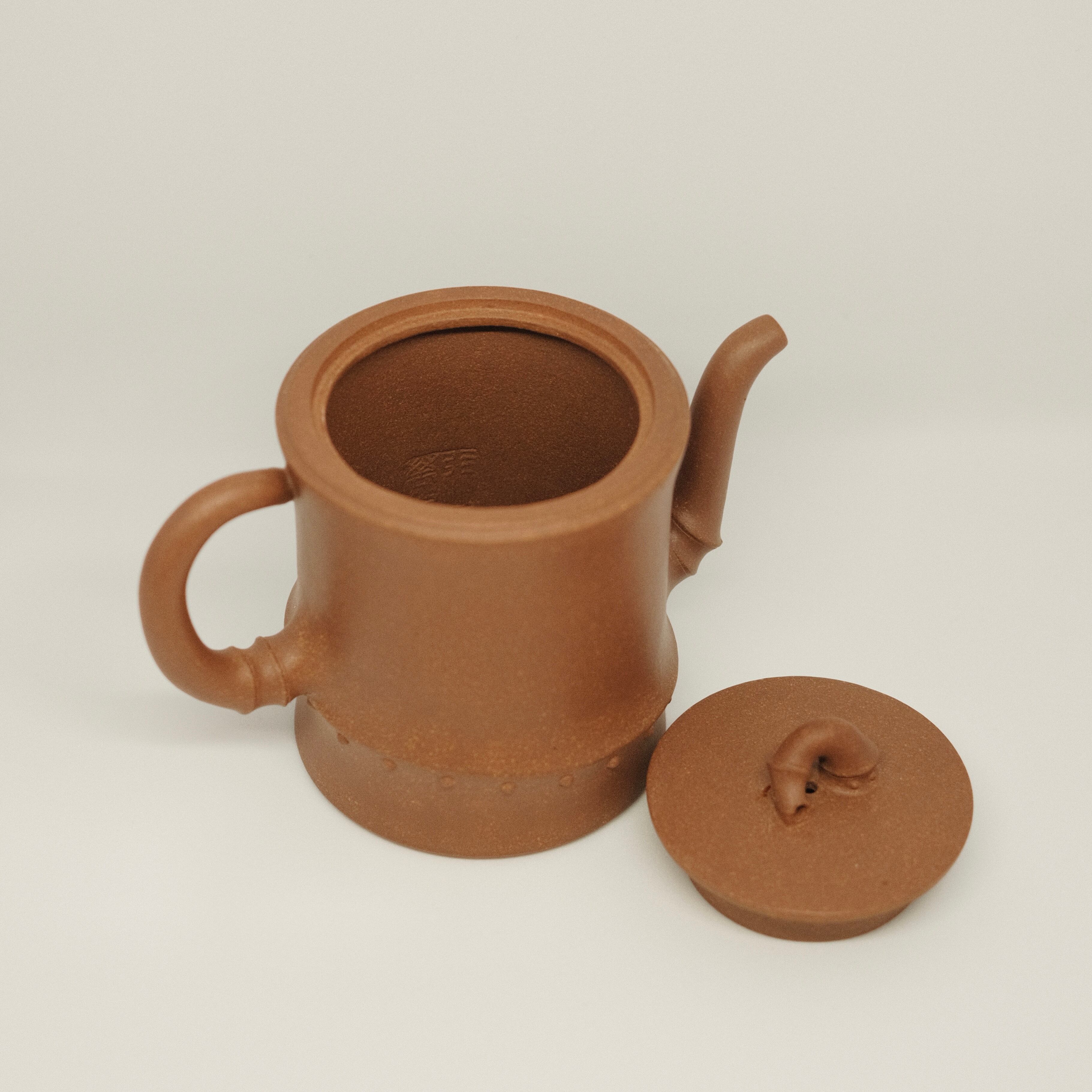 宜興産段泥を用いた全手工の紫砂壺。壺身や注ぎ口、把手に竹節の意匠を取り入れたデザインが特徴です。竹の名産地でもある宜興の風土を感じさせ、自然の趣と実用性を兼ね備えた風雅な一品です。