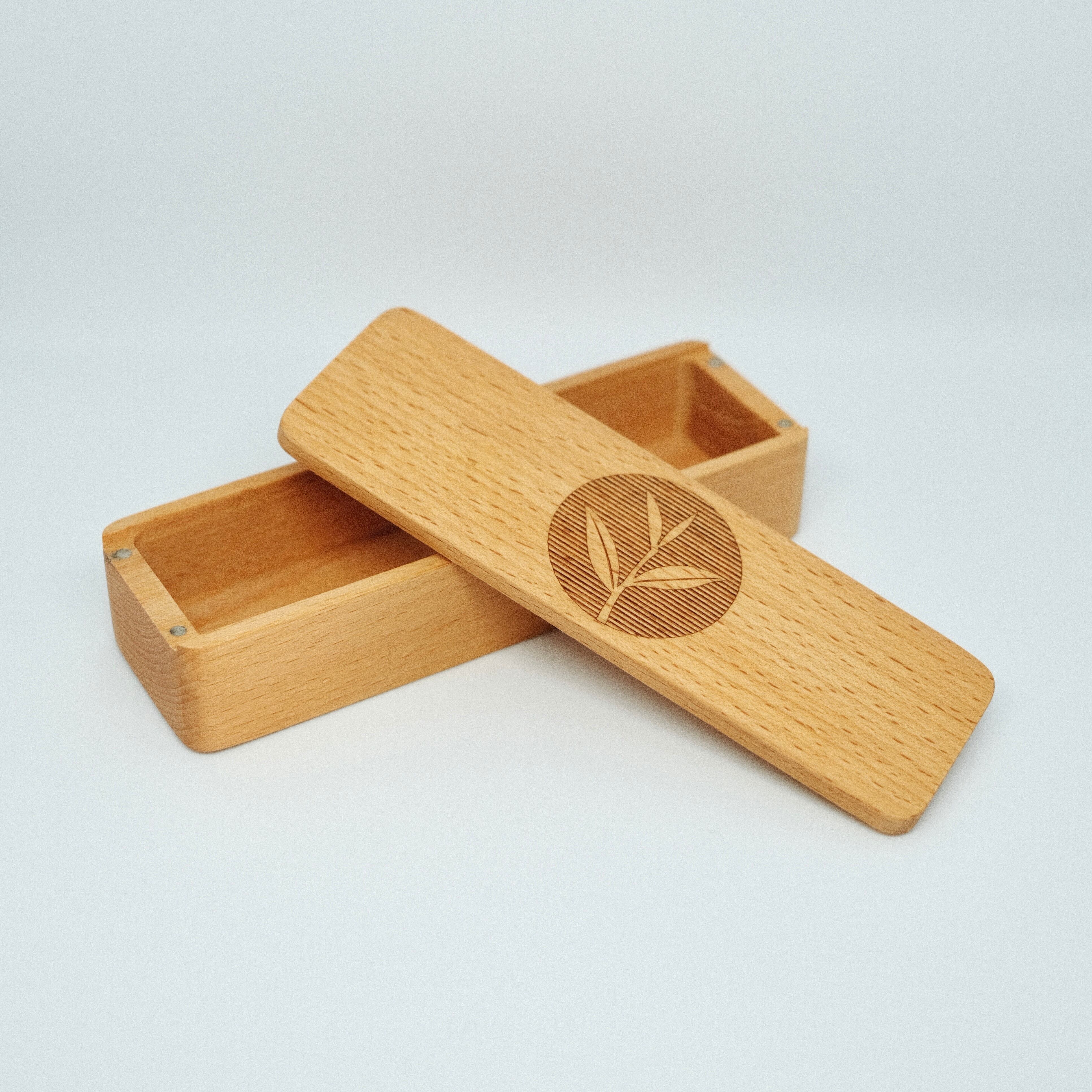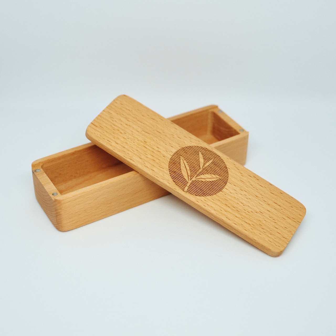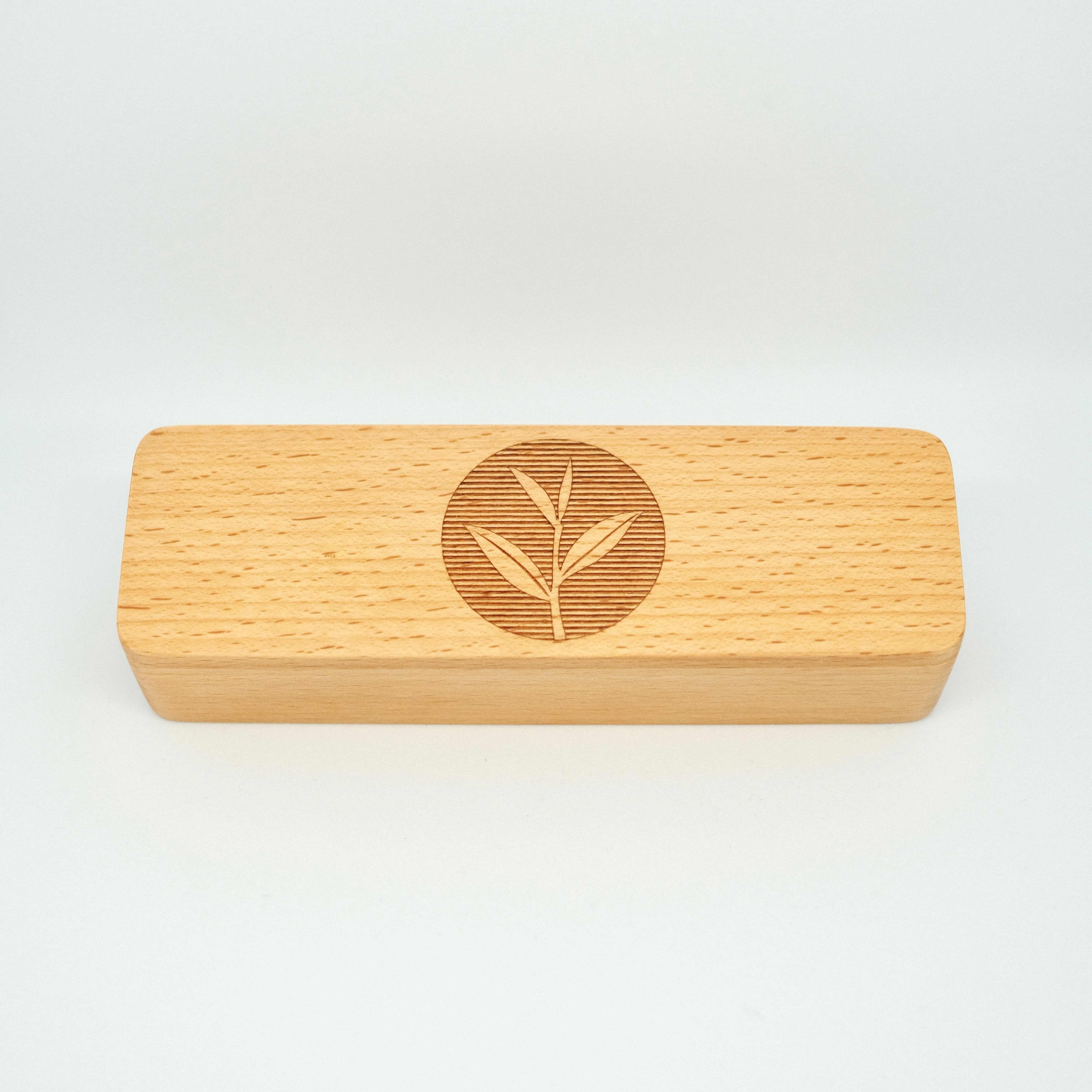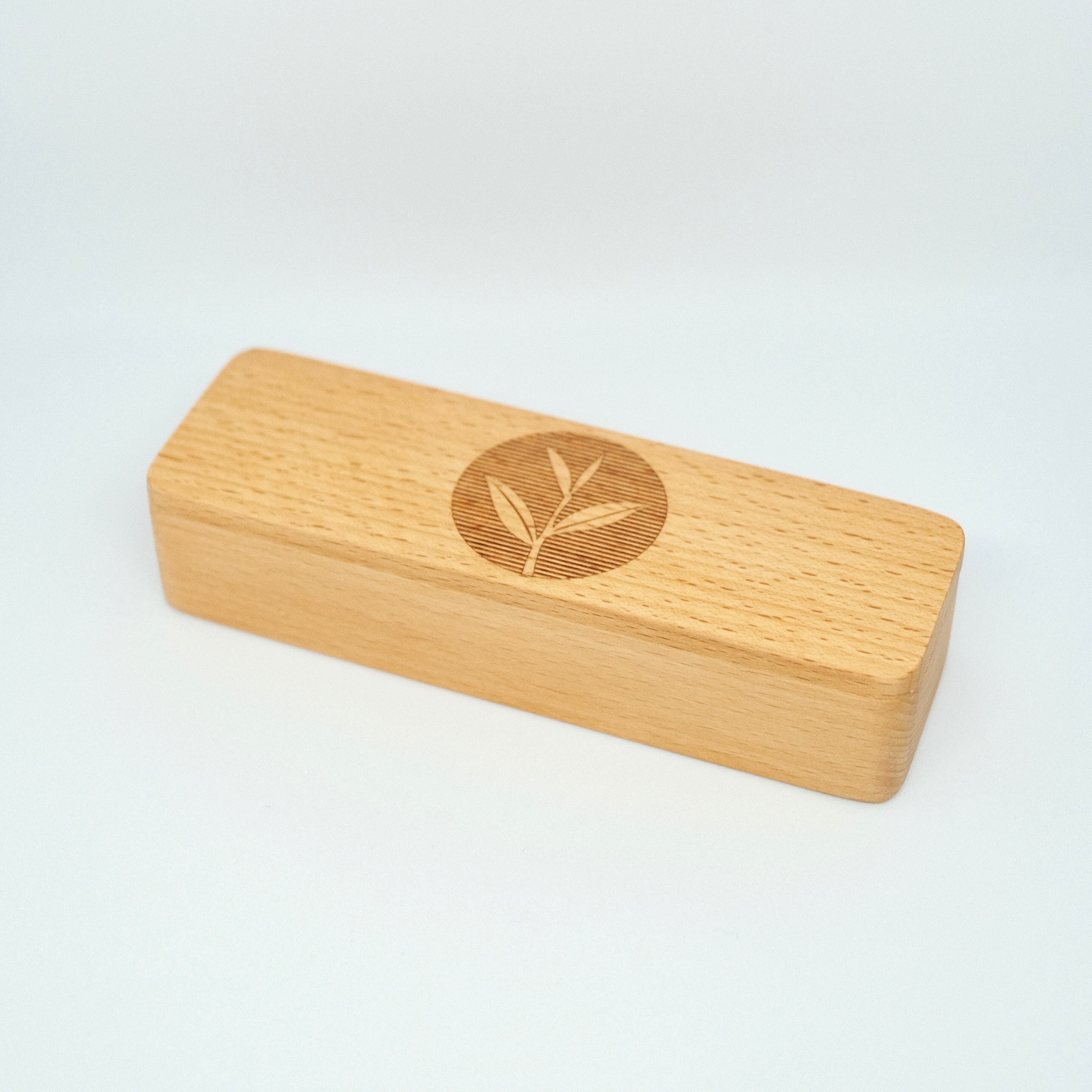 ドイツ産ブナ材の無垢材をくり抜いて成形しており、接着剤による貼り合わせを行わない安全な作りです。表面は塗装を施さず、食用オリーブオイルで仕上げた自然でやさしい手触り。スライド式の蓋に強力なマグネットを組み合わせ、片手でもスムーズに開閉でき、蓋の隙間を調整することで茶葉の取り出し量も調節可能です。