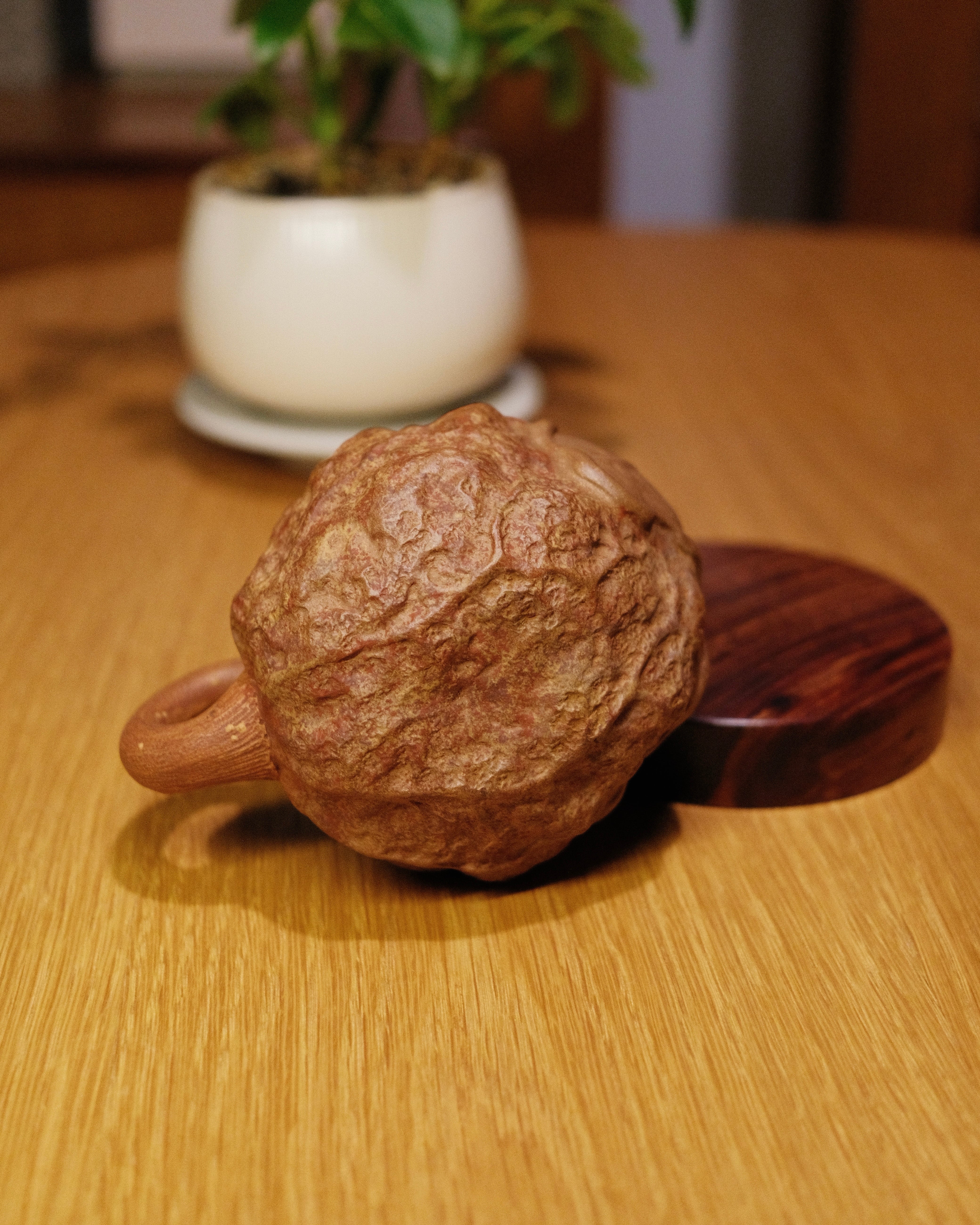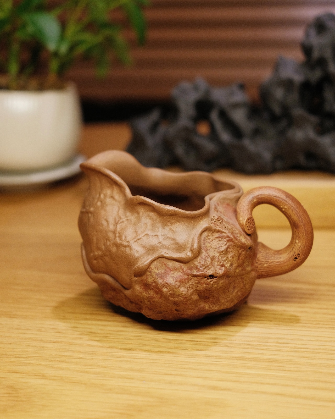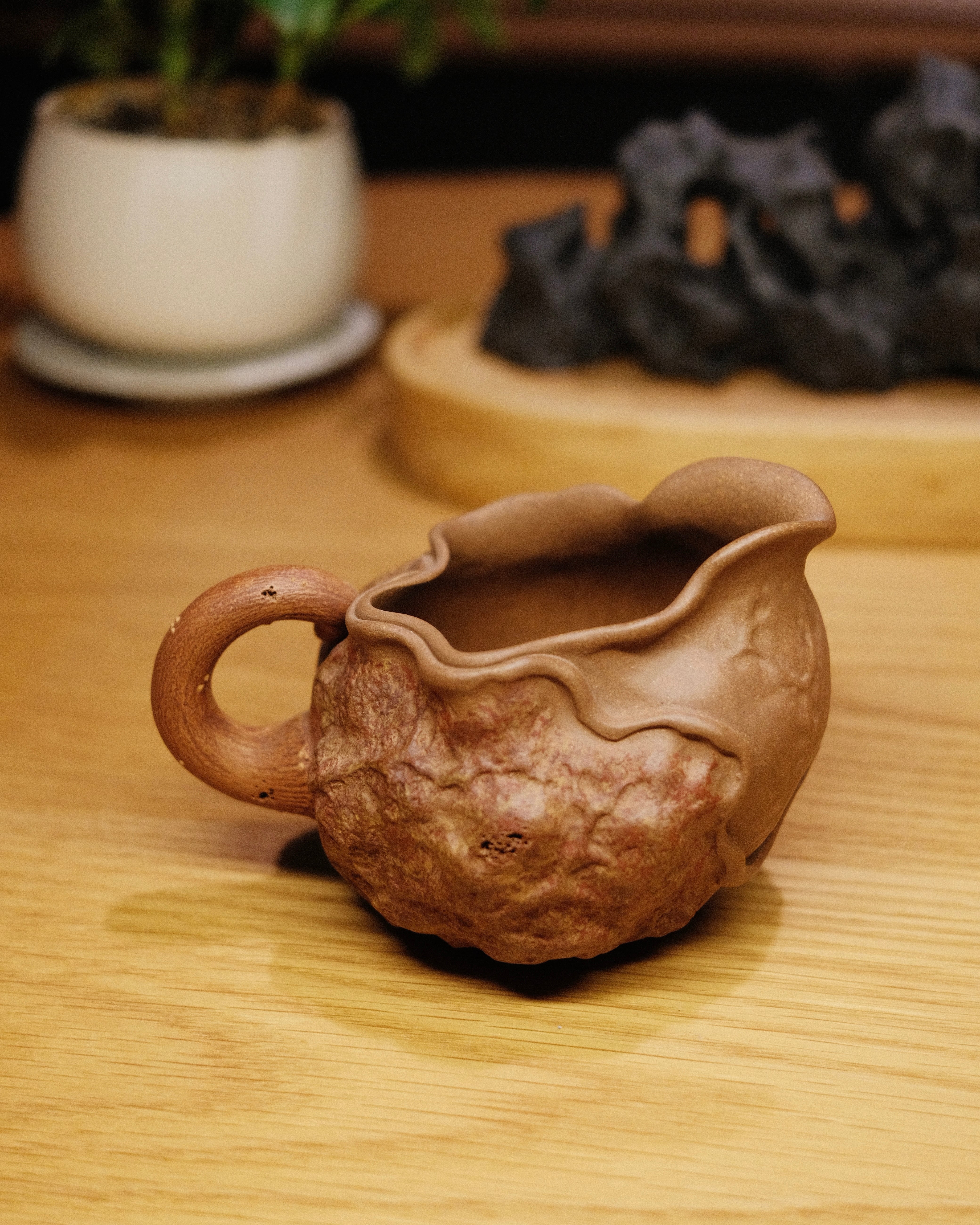 宜興産の段泥を用いた紫砂茶海。蓮の葉をモチーフにした有機的な造形が特徴で、自然味あふれる風合いと温かみのある手触りが魅力です。広がりのある注ぎ口は茶を注ぎやすく、審美性と実用性を兼ね備えた一品です。