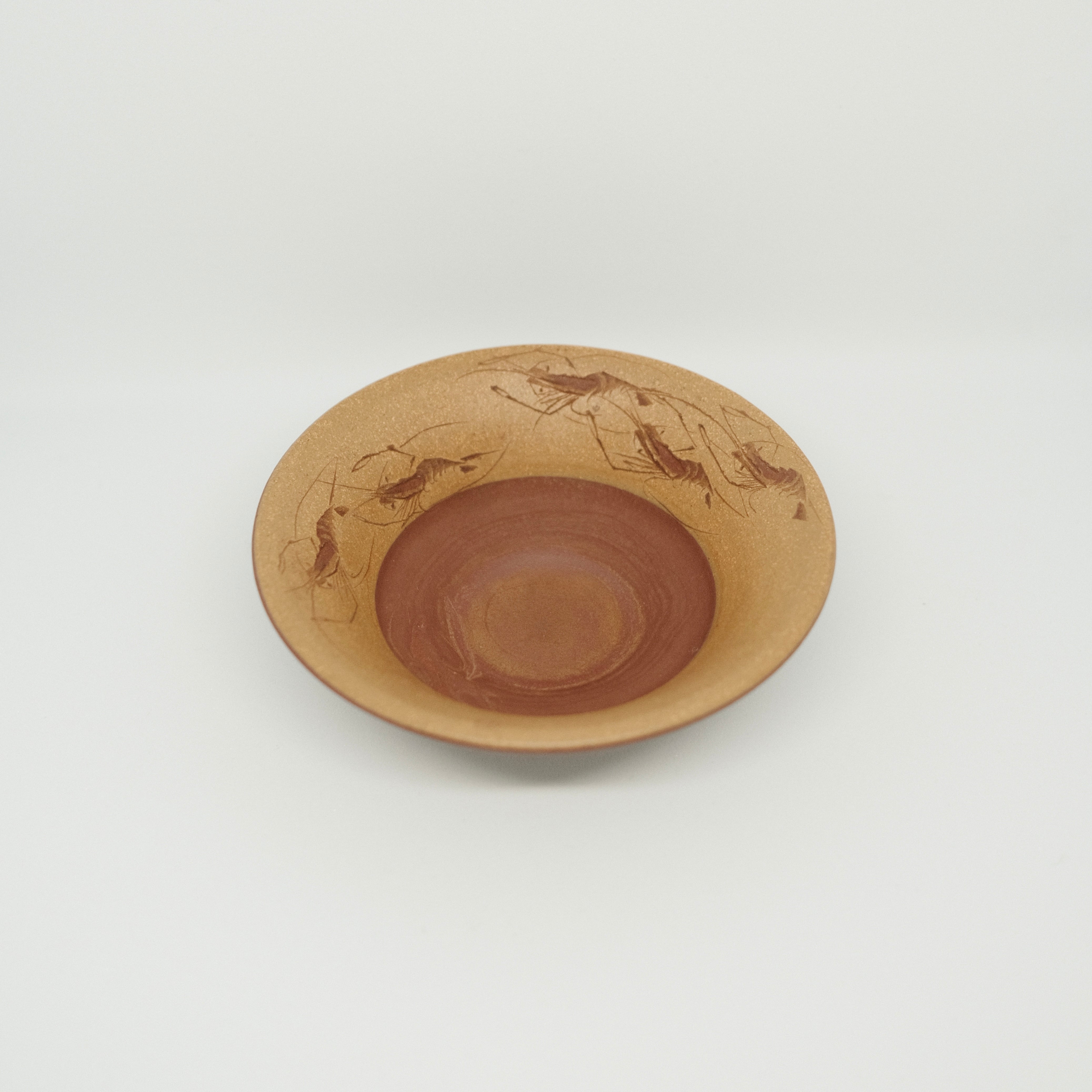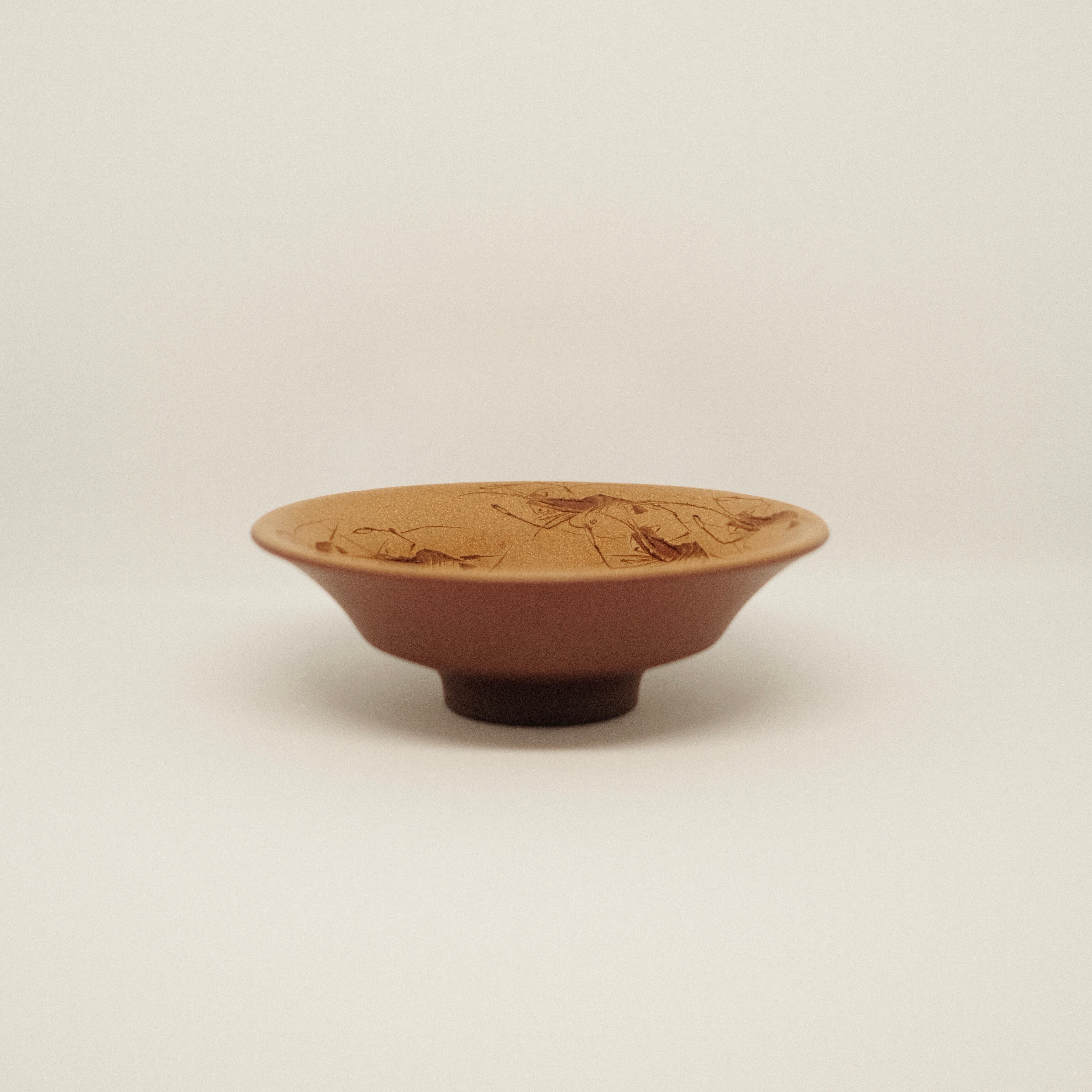 宜興の紫鉱泥を用いた全手作りの紫砂茶杯です。内側には遊び心ある闘蝦の刻絵が施され、趣のある仕上がり。美しい器形と程よいサイズ感で、日常使いはもちろん贈り物にも適した一品です。
