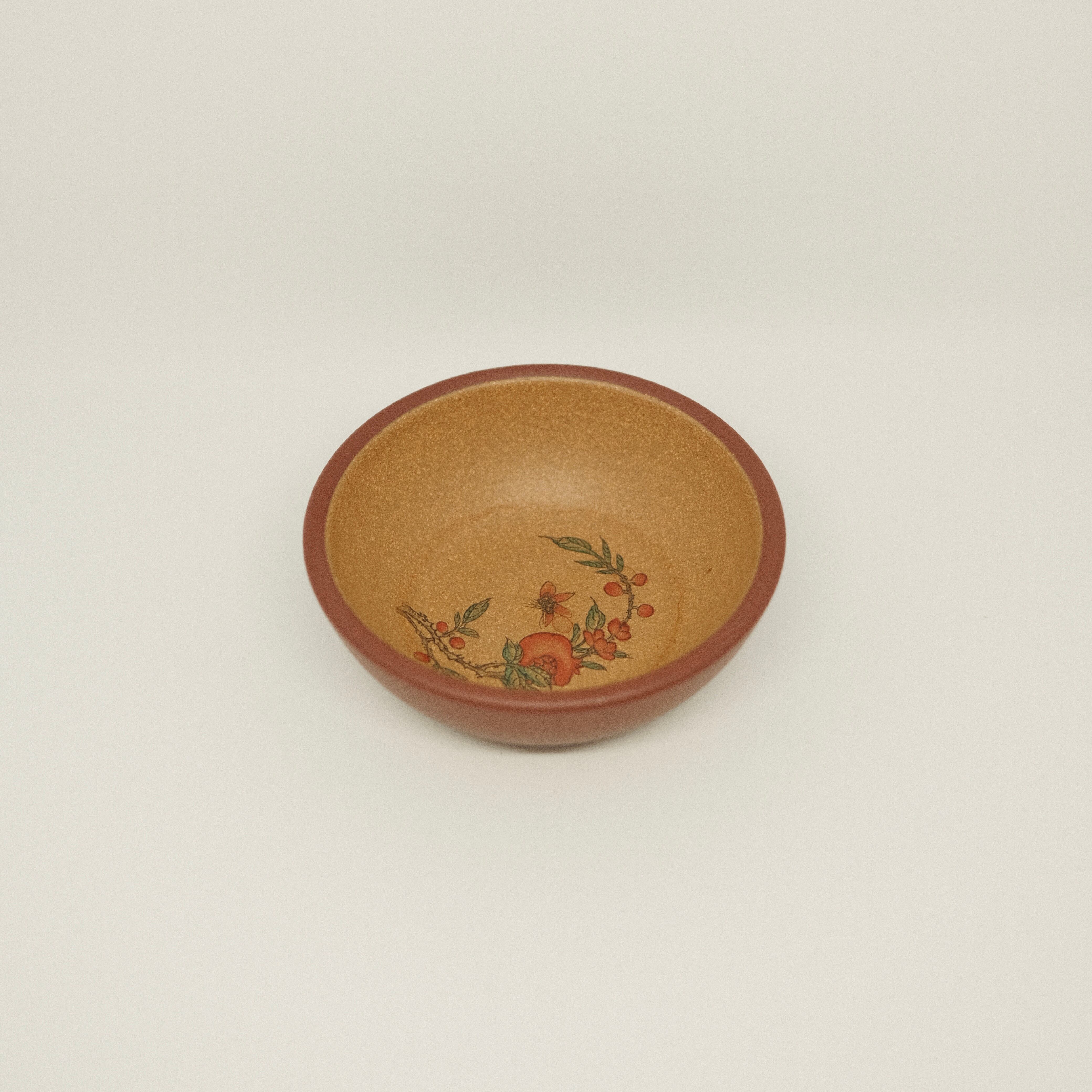 宜興の紫鉱泥を用いた全手作りの泥絵紫砂茶杯です。内側には石榴(ザクロ)が描かれ、円満や繁栄など縁起の良い象徴を添えた意匠が魅力。しっとりとした質感と美しい発色を備え、日常使いから贈り物まで幅広く活躍します。