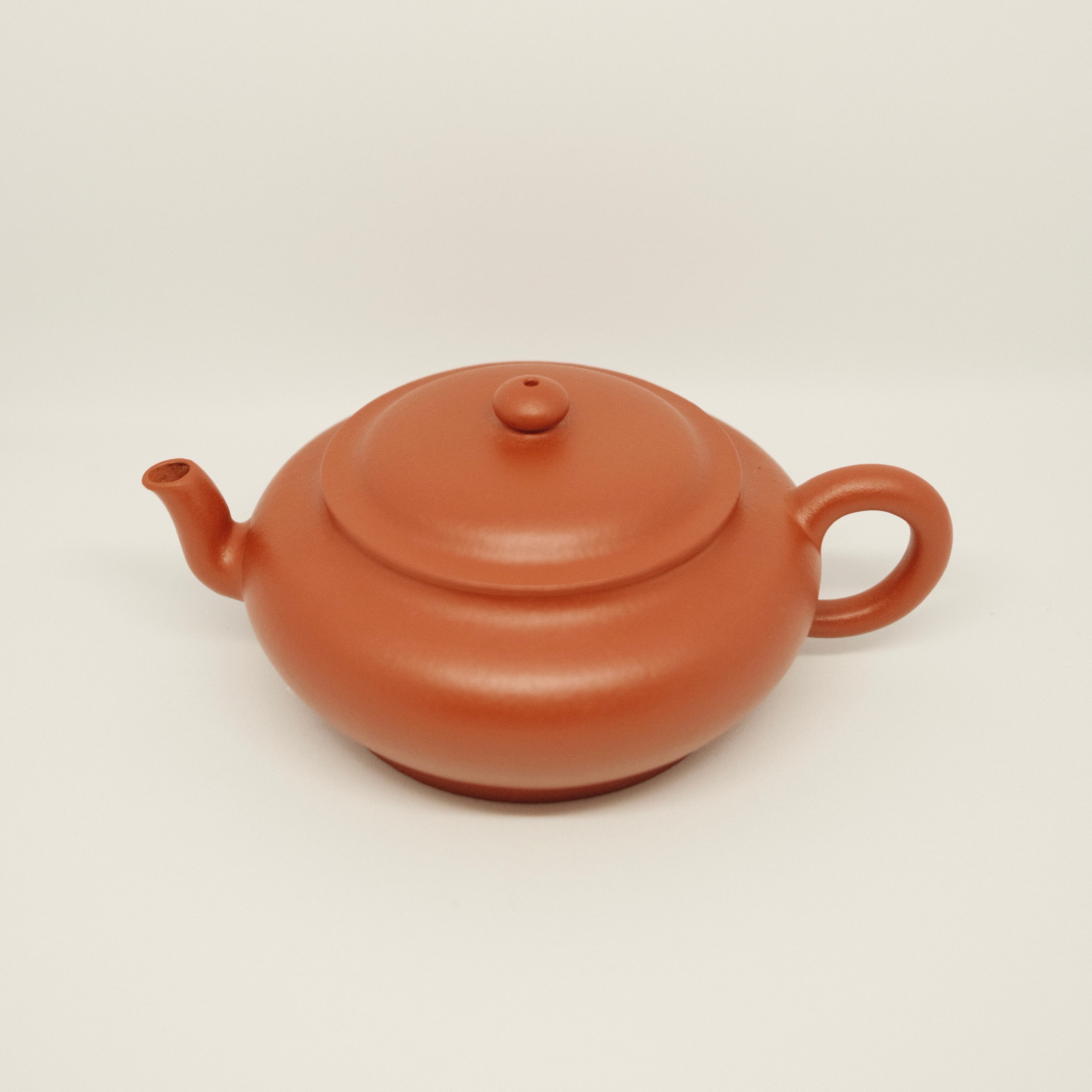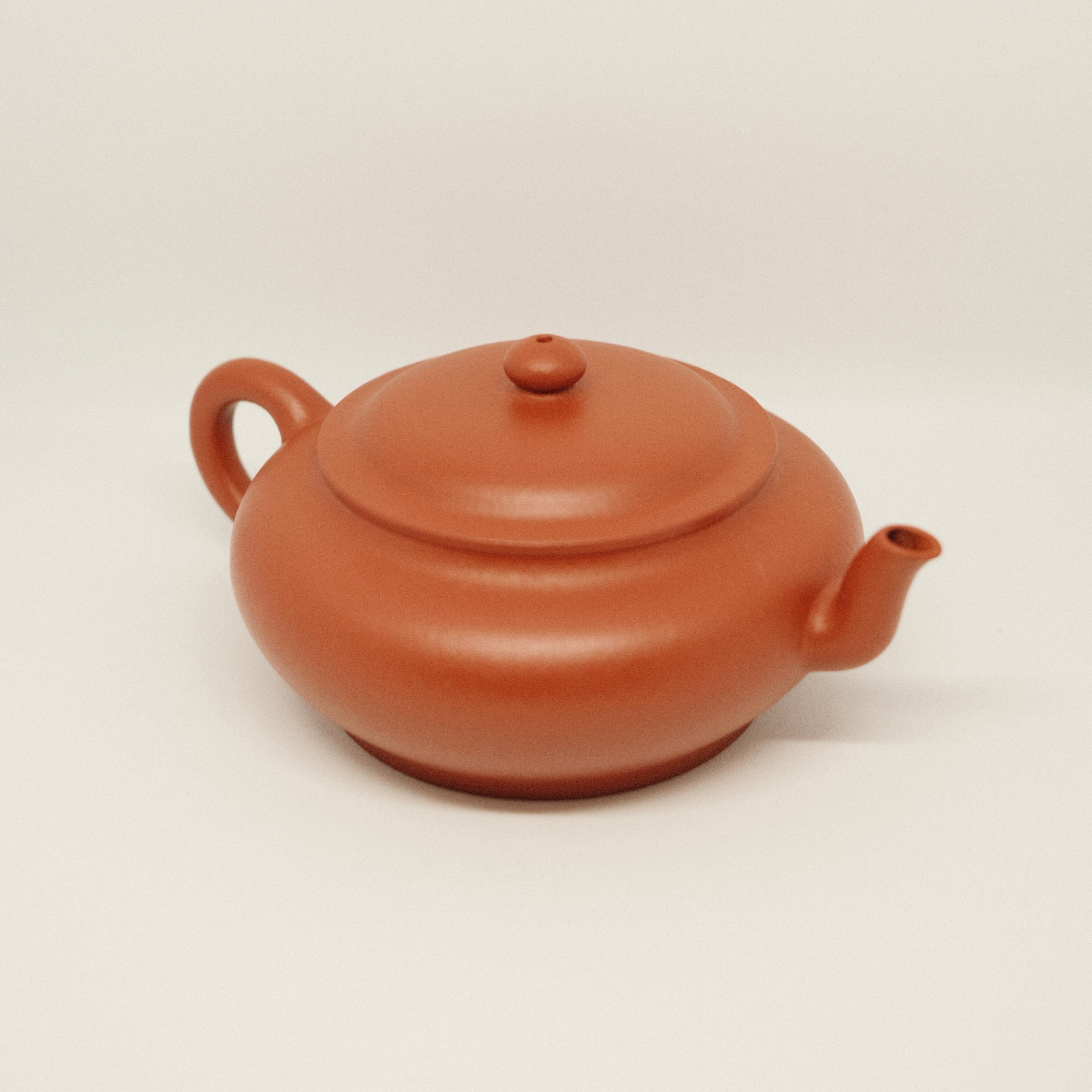 宜興紫砂壺の名工・周琦による全手作りの朱泥虚扁壺です。やわらかな線で構成された器形に、耳形の取っ手が安定感と気品を添え、素朴で奥行きある佇まいが魅力。赤玉のように温潤な泥色と、きめ細やかな質感も特徴です。注ぎ口内側は七孔仕様で、上向きの注ぎ口から力強く滑らかに注げ、切れも良好です。